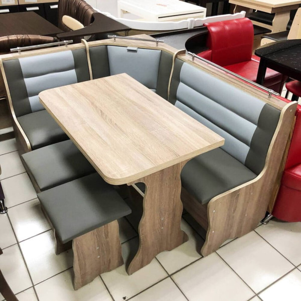 Кухонний куточок Омега від фабрики Diamand (Діамант) – це сучасна та бюджетна модель, призначена для невеликих кухонь. Виріб відрізняється компактними габаритами та функціональністю, зокрема наявністю містких ніш для зберігання під сидіннями.