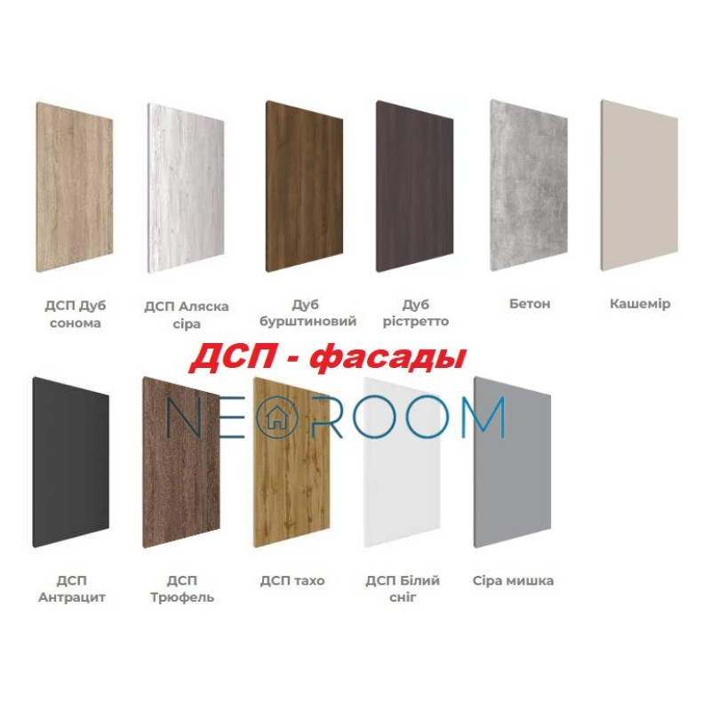 Корпус та фасади кухні «Ніка» - виконані з плити ДСП товщиною 16 мм. Корпус може бути виготовлений у 10 кольорах на Ваш вибір,