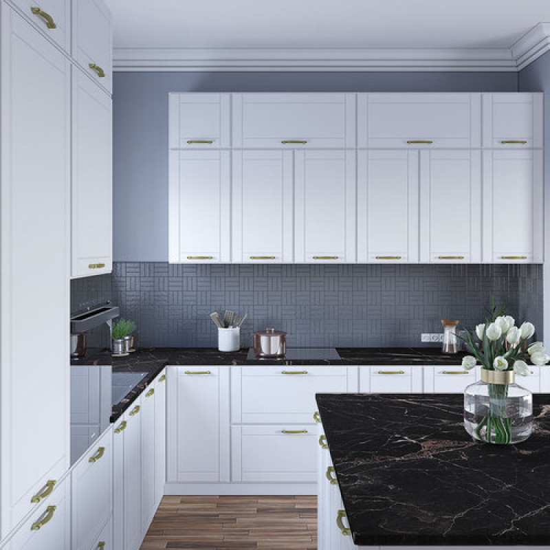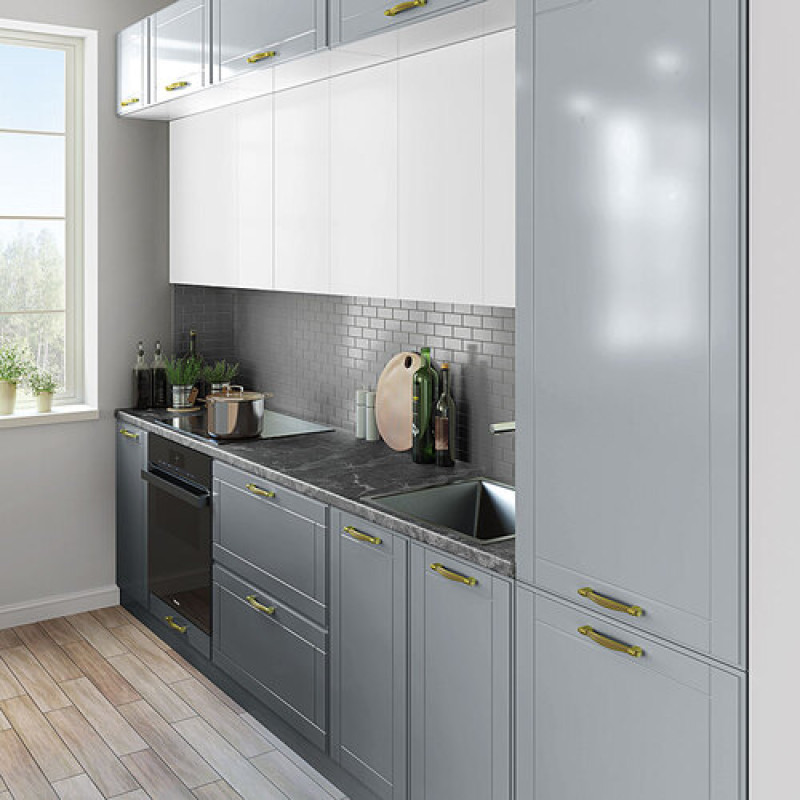 - одночасним застосуванням двох варіантів відкривання: за допомогою фрезерованої виїмки на одних фасадах та відсутністю ручок на інших, де їх роль виконує нижній торець фасадів;
