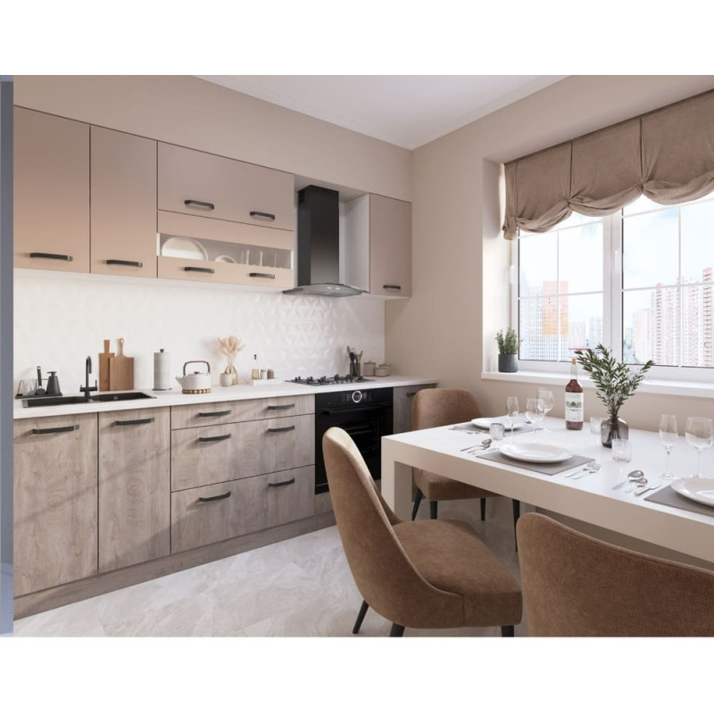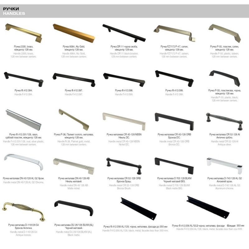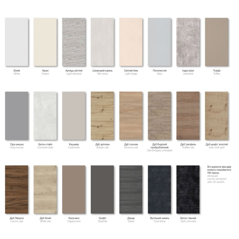 Корпус та фасади кухні «Мартa» – виконані з плити ДСП завтовшки 16 мм. Корпус може бути виготовлений у 5 кольорах на Ваш вибір, фасади у 23 кольорах.