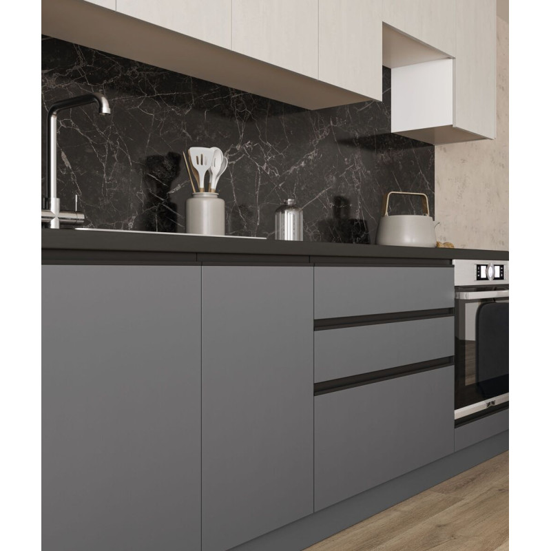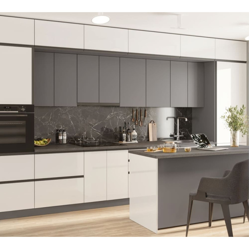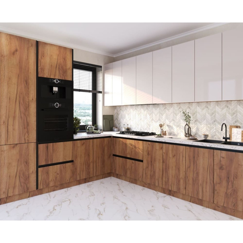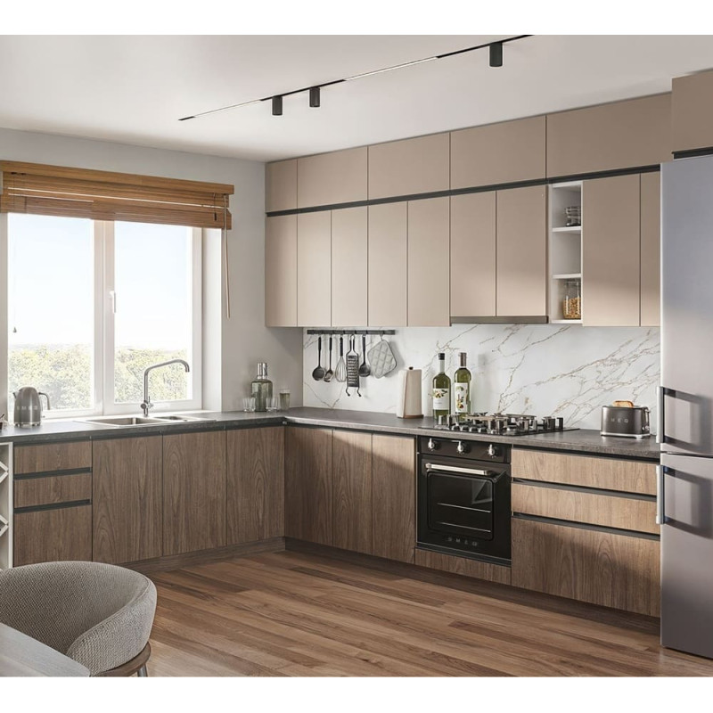 - одночасним застосуванням двох варіантів відкривання: за допомогою фрезерованої виїмки на одних фасадах та відсутністю ручок на інших, де їх роль виконує нижній торець фасадів;
