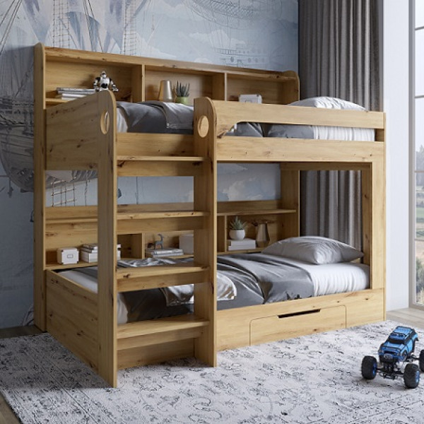 Продумана система зберігання включає полиці у спальних місць, сходи-стелаж та місткий висувний ящик для білизни або іграшок.